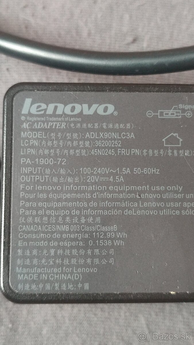 Napajaci zdroj Lenovo - [23.11. 2025]predam plne funkcny original napajaci adapter pre notebooky Lenovo 90W, 20V, 4.5A s klasickym obdlznikovym Lenovo konektorom.