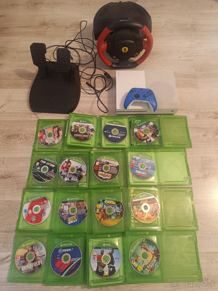 Dobrý deň, predám Xbox Oné s,1TB- 1x ovládač a 16 hier. Len osobný odber... GTA 5 Ufc 2 Sniper Elite 3. Ufc 4. Crash Bandicoot. Crash Team Rumble. Lapkova patrola-city call. Rayman. Battlefield 1. Battlefield 4. Auta:The Crew. W2K15. Farcry 3. FIFA 19. FIFA 23. Minecraft. Cena pevná:180e. Ku konzole pridám Volant aj s pedálmi zdarma. Treba si žial dokúpiť na volant jeden kábel nakoľko sa nám stratil.