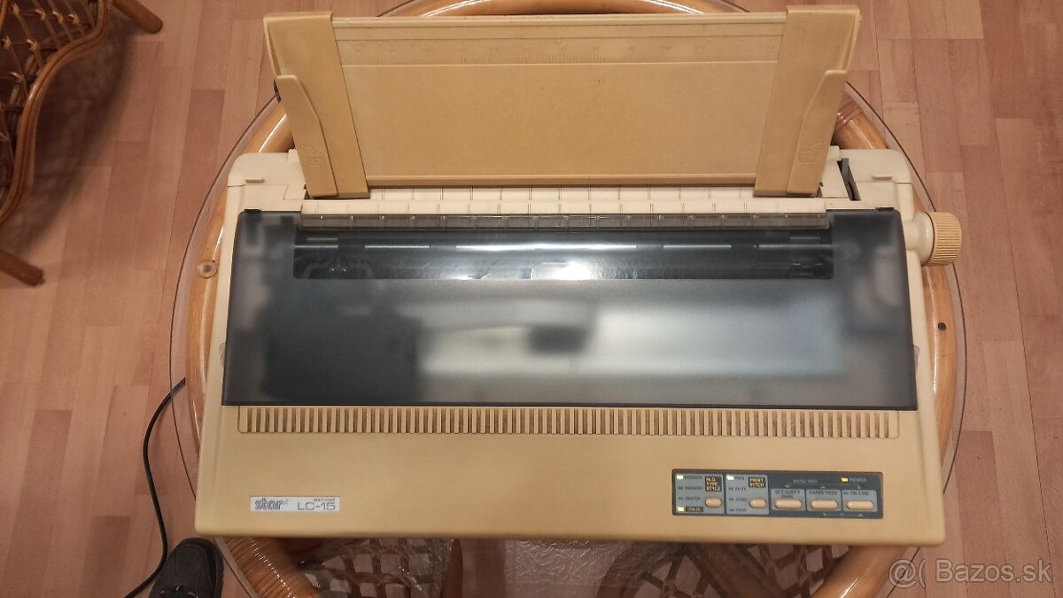 Predám ihličkovú tlačiareň STAR LC-15 zo začiatku 90-tych rokov. Je možné ju využívať na tlač formátu A4 aj formátu A3 na jednotlivé hárky papiera aj na tabelačný papier. Je funkčná a pripravená na tlač. Súčasťou predaja je kábel k elektrickej sieti. Priložený užívateľský manuál. K dispozícii sú 2 nerozbalené repasované pásky. Cena 90 €. retro, rarita, starožitnosť, pre zberateľov, vintage