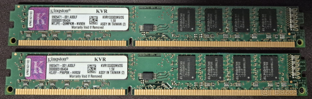 2x Kingston KVR1333D3N9/2G 2GB DDR3 Unbuffered DIMM (UDIMM), 1333MHz, CL9, 1.5V, 240-pin