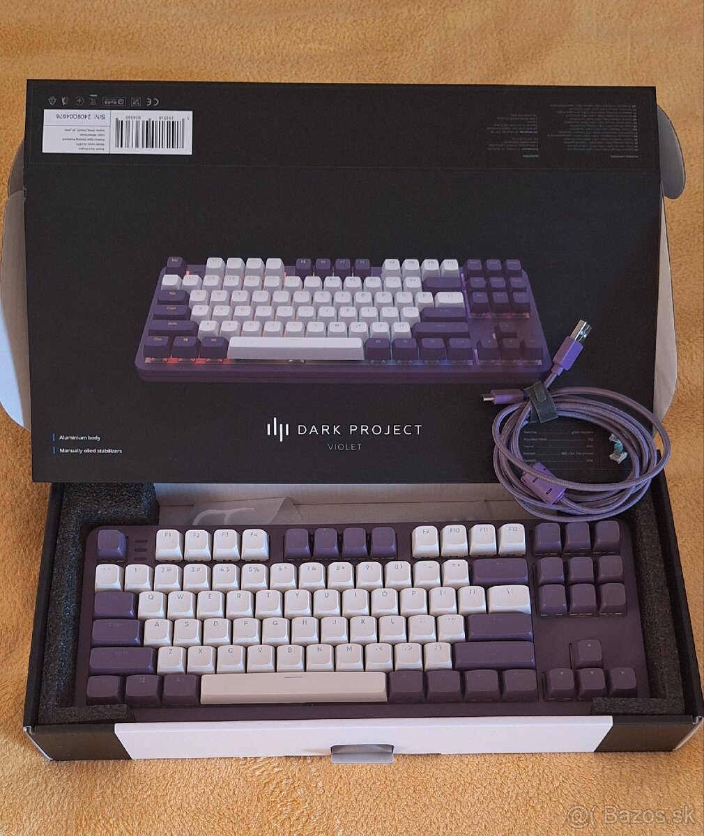 Herná klávesnica Dark Project - Violet je výborný nástroj pre všetkých hráčov.Pevná konštrukcia hráčskej klávesnice je zárukou, že tlačidlá vydržia aj sústavné búšenie. G3ms Sapphire spínače dodávajú príjemný pocit pri ovládaní hernej klávesnice. Pripojenie k výkonnému stroju pomocou USB-A. V perfektnom stave, originál krabica. Cena + pošta.