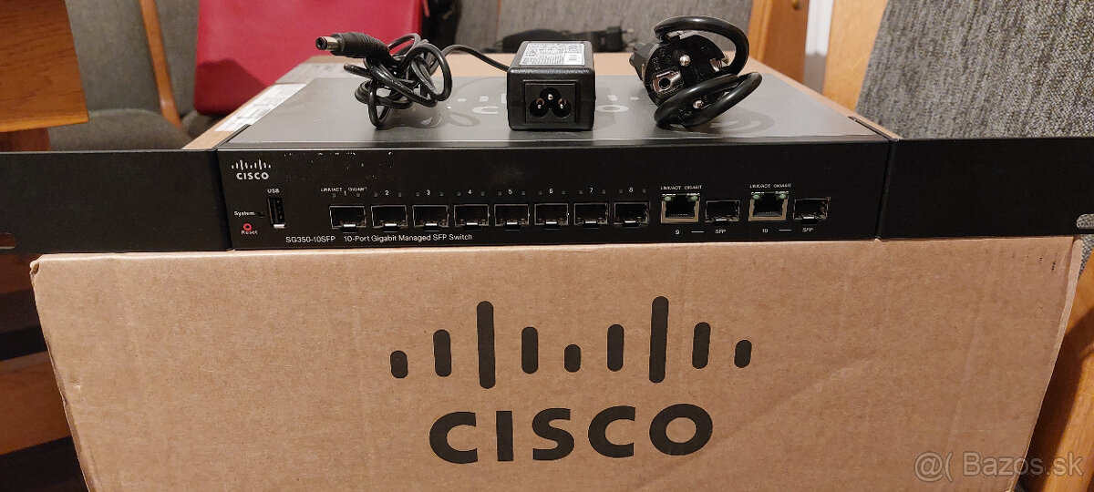 Predam 1ks Cisco managed gigabit ethernet switch model SG350-10SFP. Plne funkcny, fyzicky neposkodeny. Vratane napajacieho adaptera a montaznej sady do 19" rozvadzaca. Podrobne technicke informacie najdete tu: https://www.cisco.com/c/en/us/products/collateral/switches/small-business-smart-switches/data-sheet-c78-737359.html