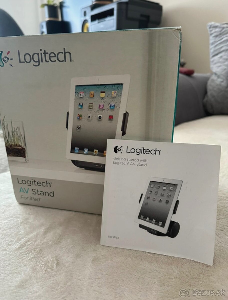 Logitech AV Stand pre iPad (30-pin) – stojan so stereo reproduktormi, nabíjaním v doku, video výstupom (RCA) do TV a diaľkovým ovládaním. Vynikajúci stav, plne funkčný. Nastaviteľný stojan na výšku aj na šírku, AUX-IN 3,5 mm pre pripojenie iných zariadení (potom možné použiť ako reproduktor aj pre iné zariadenia)