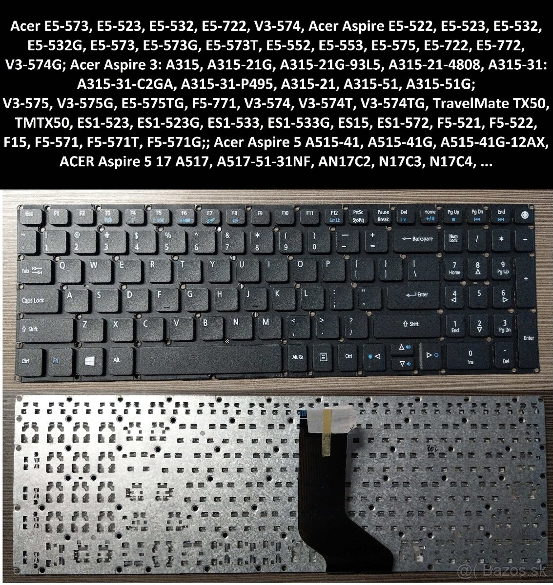 1.) Nová klávesnica na Acer E5-573, E5-523, E5-532, E5-722, V3-574, Acer Aspire E5-522, E5-523, E5-532, E5-532G, E5-573, E5-573G, E5-573T, E5-552, E5-553, E5-575, E5-722, E5-772, V3-574G; Acer Aspire 3: A315, A315-21G, A315-21G-93L5, A315-21-4808, A315-31: A315-31-C2GA, A315-31-P495, A315-21, A315-51, A315-51G; V5-591, V5-591G;; V3-575, V3-575G, E5-575TG, F5-771, V3-574, V3-574T, V3-574TG, TravelMate TX50, TMTX50, ES1-523, ES1-523G, ES1-533, ES1-533G, ES15, ES1-572, F5-521, F5-522, F15, F5-571, F5-571T, F5-571G;; Acer Aspire 5 A515-41, A515-41G, A515-41G-12AX, ACER Aspire 5 17 A517, A517-51-31NF, AN17C2, N17C3, N17C4, ... a podobné modely. Varianty s malým, či veľkým enterom, tiež podsvietené.
