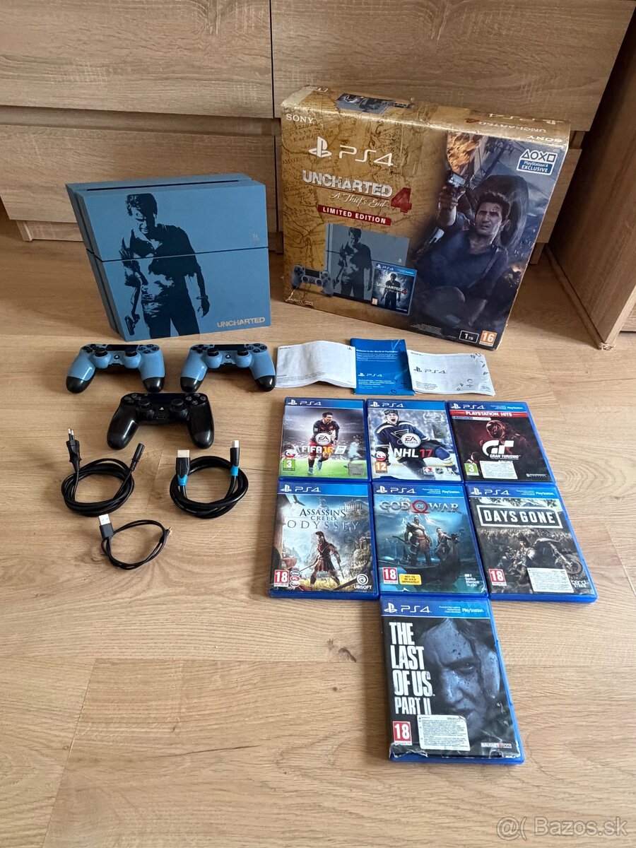 Ponúkam na predaj v dokonalom stave plne funkčnú, vyčistenú a nepoškodenú hernú konzolu PS4 verzie FAT model CUH-1216A s veľkosťou úložiska 1TB (1000 gigabajtov) so softvérovou verziou 13.04 v mimoriadne vzácnej limitovanej edícii s motívom hry Uncharted 4 spoločne s originálnou krabicou, ktorá obsahuje kompletné balenie a originálnu výplň , kompletnými manuálmi, všetkou kabelážou (napájací, HDMI a nabíjací kábel) , v cene pridávam aj 3x originálne ovládače Sony DualShock V1 a V2 , z toho 2 limitovanej edície Uncharted 4 a 1 čierny a súčasťou sú aj 7x originálne a plne funkčné PS4 hry , konzola aj ovládače sú po kompletnom čistení a renovácii , avšak 1 limitovaný ovládač nie je plne funkčný , nakoľko je na ňom poškodených viacero dielov , na konzole bola vymenená stará termálna pasta za čerstvo novú , takže konzola sa neprehrieva , funguje bezproblémovo, plynulo a neseká sa , momentálne je obnovená do továrenských nastavení pripravená na ďalšie dlhodobé hranie a svojho majiteľa , stačí len pripojiť a hrať