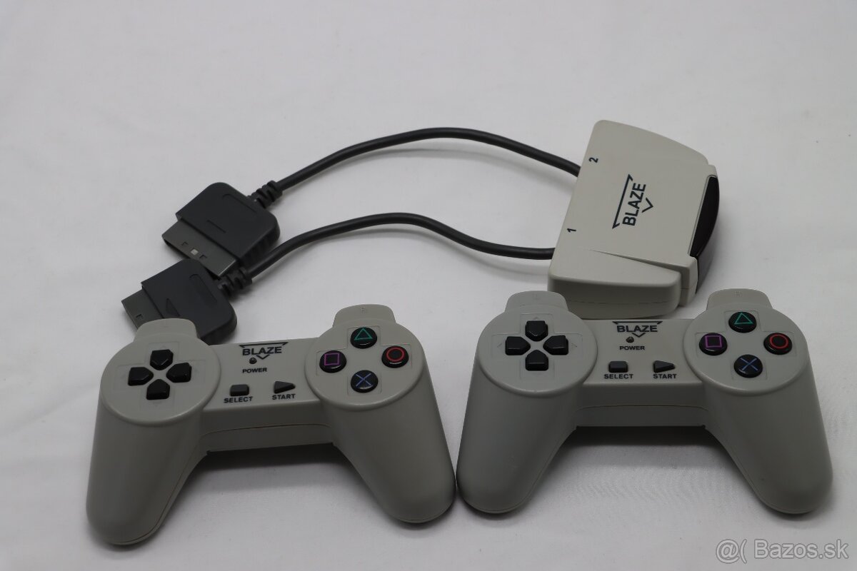 Predám bezdrôtový set BLAZE pre PlayStation 1: 2× ovládač + prijímač do konzoly. Ovládače fungujú na AAA batérie – hranie bez kábla.