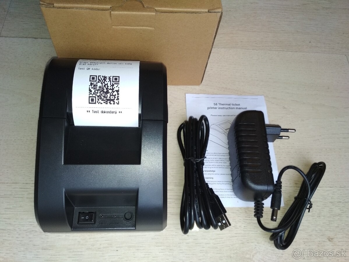Balenie obsahuje: tlačiareň, adaptér 230V/9V, usb kábel, 1ks rolka papiera